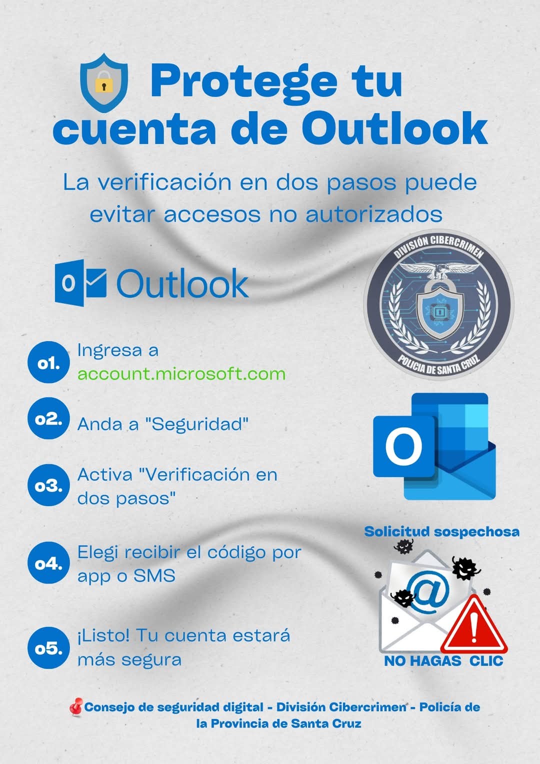 #Ciberseguridad #GmailSeguro #OutlookProtegido #VerificaciónEnDosPasos #EvitaEstafas #DivisiónCibercrimen #SantaCruzSegura #Phishing #FraudeDigital #destacar