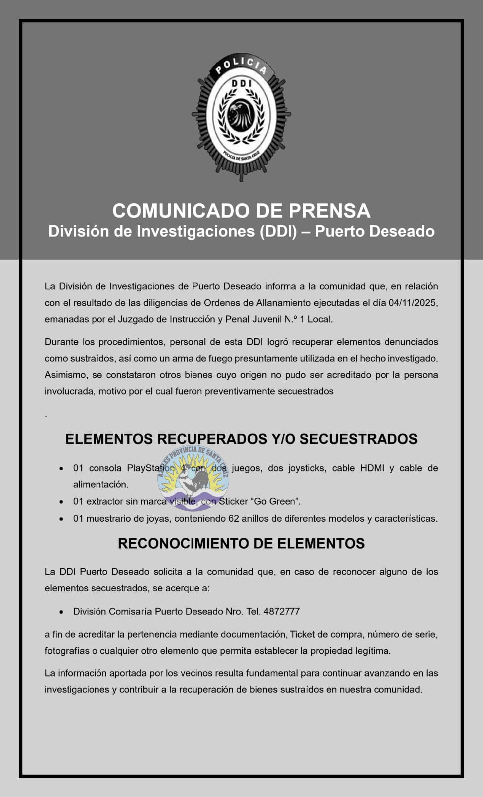 DDI Puerto Deseado solicita colaboración ciudadana tras recupero de elementos